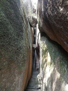 在福建寧德太姥山的狹窄山壁間,一名遊客…